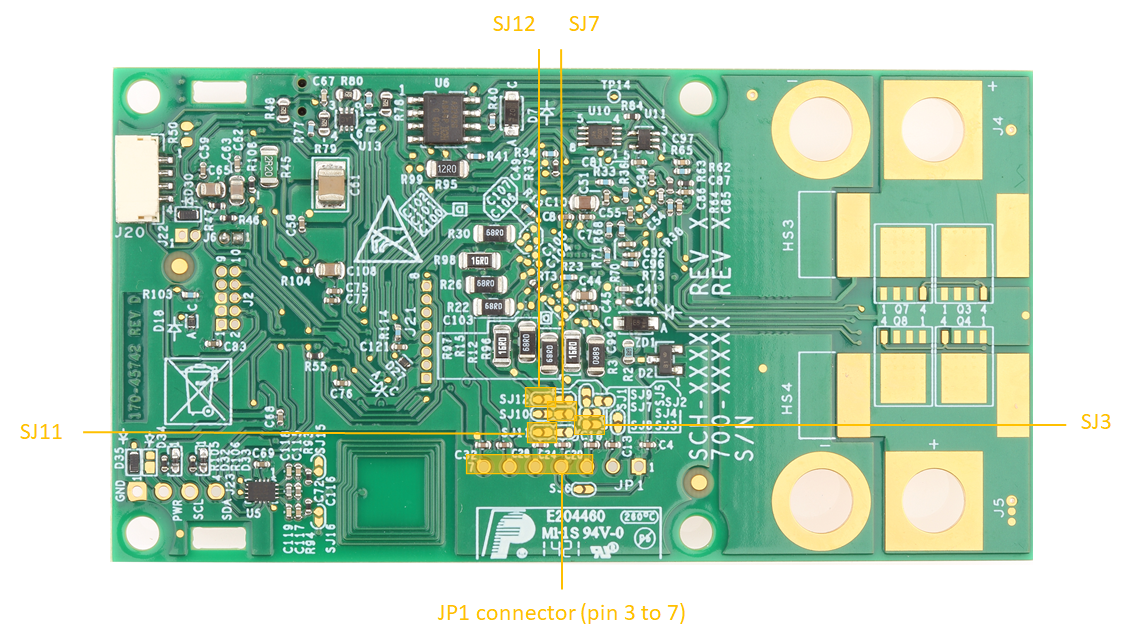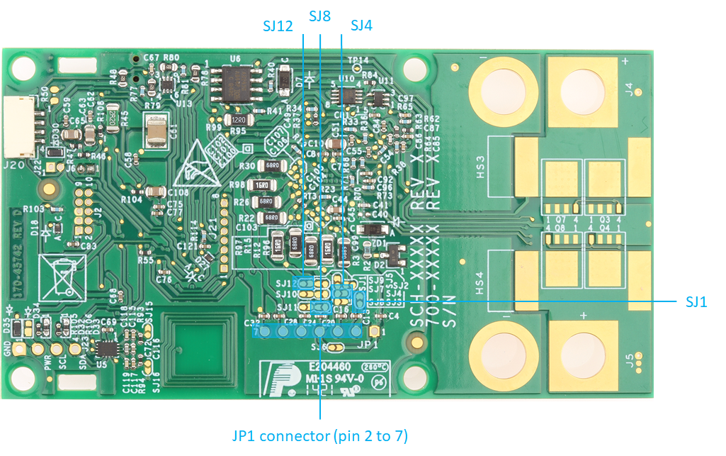 The shunt resistor (R1) can be disconnected from the overcurrent protection circuit and the BCC by unsoldering the SJ13 and SJ14 jumpers. Both jumpers are closed by default.
