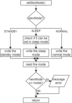 The SBC part is used to control the power of voltage regulators V1 (The most used 3.3V (VCC_3V3_SBC)) and V2 (CAN PHY) (VCC_5V_SBC). With the setSbcMode() function the mode of the SBC can be set. In the normal mode both V1 and V2 are active, in the standby mode V2 is off, turning off the CAN transceiver and in the sleep mode both V1 and V2 are off, turning off almost the whole BMS board. In Figure 10 the simplified flowchart of this function can be seen. Besides power regulators, the SBC has a watchdog, which is used to reset the MCU if it doesn’t "kick" (reset) the watchdog within the set time. The reset of the MCU this is done via the NRST pin.