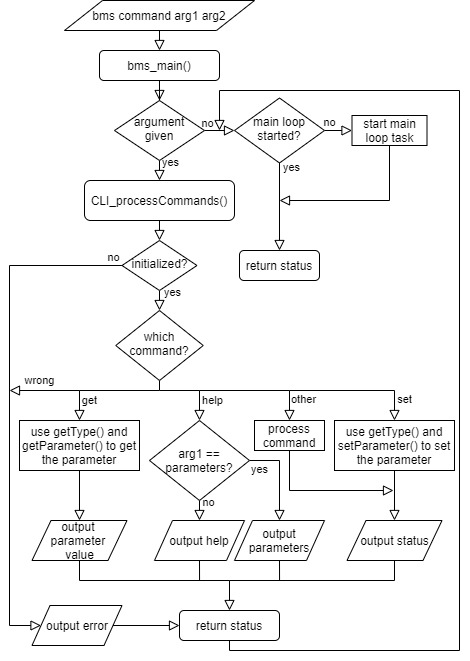 If there are commands given when calling the BMS application, the CLI process commands function will be called to handle it. It will parse the command and optionally the arguments and check if the inputs are valid. If it is valid, it will act based on which command has been given. The flowchart can be seen in Figure 6.
